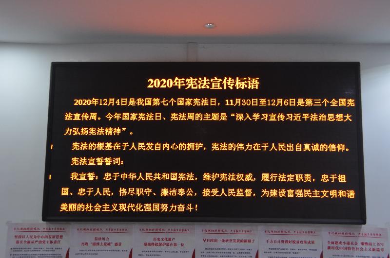 創(chuàng)新宣傳形式,營(yíng)造濃厚氛圍。宣傳周內(nèi),我隊(duì)通過制作張貼主題海報(bào)、電子屏播放宣傳標(biāo)語、微信群轉(zhuǎn)發(fā)法治動(dòng)漫微視頻優(yōu)秀作品等“可看、可聽、可學(xué)”的方式,向全隊(duì)干部職工宣傳涵蓋12.4全國(guó)法制宣傳日和宣傳周的由來,我國(guó)憲法規(guī)定的重點(diǎn)內(nèi)容、發(fā)展歷史及其重大歷史意義,習(xí)近平法治思想的現(xiàn)實(shí)意義和深刻內(nèi)涵等內(nèi)容,讓憲法宣傳入腦入心。