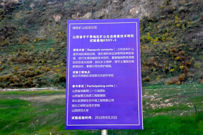2018年8月20日,我隊(duì)與湖北三峽職業(yè)技術(shù)學(xué)院、湖北金源綠通生態(tài)環(huán)境工程有限公司、山西師范大學(xué)共同出資共建礦山師范基地,對(duì)龍祠泉地質(zhì)災(zāi)害環(huán)境修復(fù)治理項(xiàng)目中遺留的石渣邊坡開展生態(tài)恢復(fù)試驗(yàn),此次試驗(yàn)采用的技術(shù)是在渣土坡噴射Ecoflex生境基材(可生物降解新型材料)、土以及種子等生物培育料。經(jīng)過(guò)兩個(gè)多月的試驗(yàn),該生態(tài)修復(fù)新技術(shù)研究應(yīng)用取得良的好治理實(shí)效。