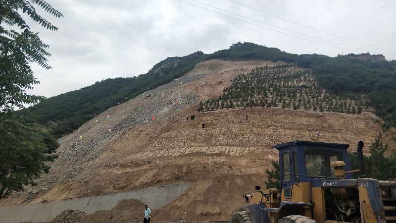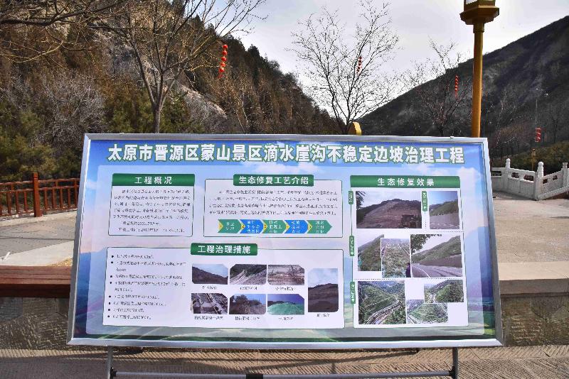 晉源區(qū)蒙山景區(qū)滴水崖溝不穩(wěn)定邊坡生態(tài)修復治理工程項目是二一三地質(zhì)隊有限公司在山西省范圍內(nèi)開展“巖石覆綠”的成功應用。滴水崖溝是進蒙山大佛主景區(qū)的必經(jīng)之路,該段公路的邊坡安全直接影響景區(qū)旅游環(huán)境安全。治理區(qū)域沿坡公路長度為260m,治理高度為106m,治理總面積2.5萬m2。通過工程治理,消除了地質(zhì)災害隱患,確保了周邊環(huán)境安全。根據(jù)地質(zhì)單元的不同選取最優(yōu)物種進行生態(tài)修復,在美化環(huán)境的同時又成為了蒙山景區(qū)的一處亮點。該工程已于2018年10月份完工并交付景區(qū)使用。完工后至今,坡面與周邊未遭受破壞的生態(tài)環(huán)境已融為一體,生態(tài)治理成效顯著。
