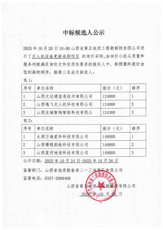 山西省第五地質(zhì)工程勘察院有限公司無(wú)人機(jī)設(shè)備更新采購(gòu)項(xiàng)目中標(biāo)候選人公示