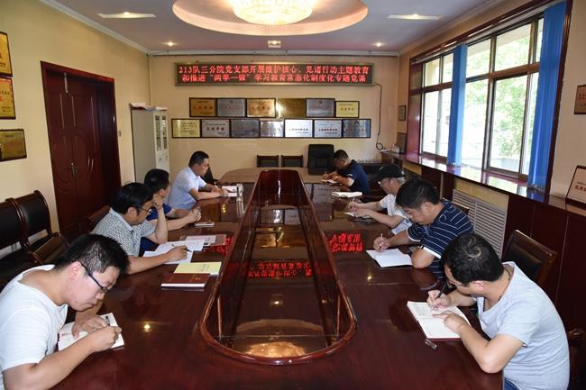 為了扎實開展“維護核心、見諸行動”主題教育活動,深入推進“兩學一做”學習教育常態(tài)化制度化,近日,二一三隊副隊長施德剛以“學習習近平治國理政的科學思維方式”為主題,為三分院黨支部黨員上了一堂主題鮮明、內(nèi)容豐富的黨課,黨課由三分院黨支部書記張紅峰主持。
