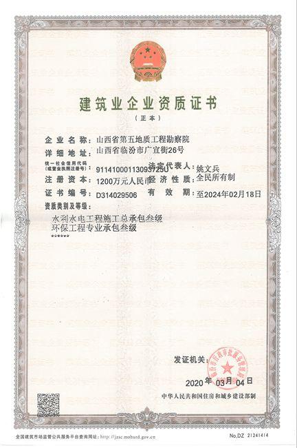 為貫徹地勘局“做強事業(yè),走強市場”的業(yè)務(wù)布局,二一三隊圍繞 “發(fā)揮優(yōu)勢、對接需求、支撐政府、服務(wù)社會”的工作思路,全力拓展服務(wù)領(lǐng)域,積極申辦了水利水電工程施工總承包叁級、環(huán)保工程專業(yè)承包叁級等資質(zhì),現(xiàn)資質(zhì)已通過審批獲得證書。