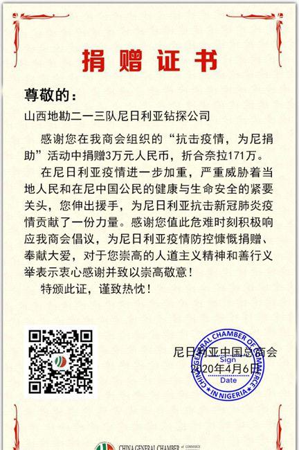 近日,213隊尼日利亞鉆探公司收到尼政府部門和駐尼中國總商會的抗疫捐贈感謝信。感謝213隊尼日利亞鉆探公司一如既往地支持尼日利亞人民,為尼抗擊新冠疫情做出了積極表率和貢獻。