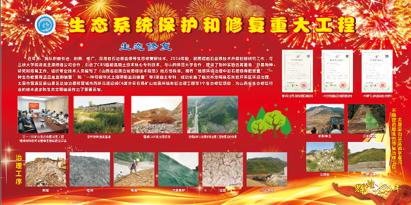 自2016年起,我隊就圍繞巖石覆綠技術(shù)開展創(chuàng)新研究工作,與三峽大學和湖北金源綠通公司合作,引進了CBS植被混凝土技術(shù)核心專利技術(shù)。與山西師范大學合作,建設(shè)了物種實驗選育基地,開展物種研究和培育工作。組織專業(yè)技術(shù)人員編寫了《山西省巖質(zhì)邊坡覆綠技術(shù)規(guī)范》地方性標準。擁有“生態(tài)修復(fù)用溫濕度監(jiān)測裝置”和“地質(zhì)環(huán)境治理中巖石覆綠保肥裝置”等2項自主專利,成功實施了臨汾市龍祠泉石灰?guī)r開采區(qū)環(huán)境治理、太原市晉源區(qū)蒙山景區(qū)邊坡治理和晉城市西環(huán)高速沿線C6廢棄采石場礦山地質(zhì)環(huán)境恢復(fù)治理工程等3個巖石覆綠項目,開創(chuàng)了干旱半干旱氣候條件下生態(tài)治理的新途徑,為山西省生態(tài)修復(fù)行業(yè)的技術(shù)進步和生態(tài)文明建設(shè)作出了重要貢獻。
